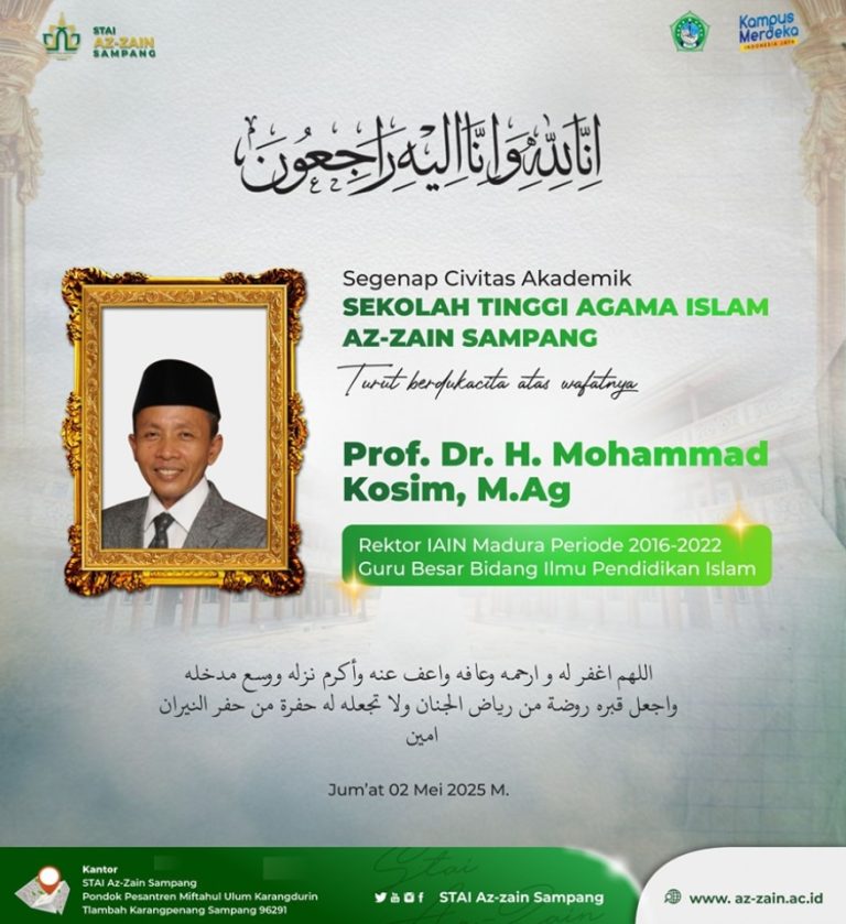 Keluarga besar Sekolah Tinggi Agama Islam Az-Zain Sampang (STAIZA) menyampaikan rasa duka yang mendalam atas wafatnya: